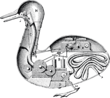 The world’s first successfully-built biomechanical automaton is considered to be The Flute Player, which could play twelve songs, created by the French engineer Jacques de Vaucanson in 1737. He also constructed The Tambourine Player and the Digesting Duck, a mechanical duck that – apart from quacking and flapping its wings – gave the false illusion of eating and defecating, seeming to endorse Cartesian ideas that animals are no more than machines of flesh.[51]