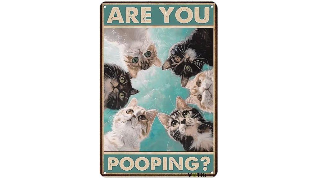 Black Cat tin signs feature a slim 8×12-inch aluminum plate at 4.3 ounces with polished edges, rounded corners, and a matte finish that reduces glare. The Art Deco “Are you Pooping?” print is clear and UV-stable. Four corner holes make mounting simple with screws or small nails, even on drywall. Anti-rust construction handles rain, sun, and humidity; a wipe preserves color. Suits bathrooms, dorms, cafes, and gifts. Clean retro-modern styling and discreet branding enhance value. More specifics follow.