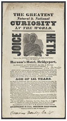 African American slave turned sideshow performer Joice HethBornc. 1756DiedFebruary 19, 1836 (aged 79–80) Joice Heth (c. c – c. 1756 – February 19, 1836) was an […]