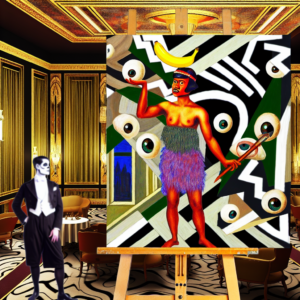More Disumbrationist paintings followed: a composition of zig-zag lines and eyeballs he called Illumination; a garish picture of a black woman doing laundry that he called Aspiration, and which a critic praised as “a delightful jumble of Gauguin, Pop Hart and Negro minstrelsy, with a lot of Jerdanowitch individuality”;: 111 Gination, an ugly, lopsided portrait; and a painting named Adoration, of a woman worshipping an immense phallic idol, which was exhibited in 1927.
