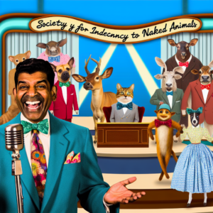 The Society for Indecency to Naked Animals, or SINA [pronounced “sinna”], was a satirical hoax concocted by serial prankster Alan Abel. The group used the language and rhetoric of conservative moralists for the ostensible aim of clothing “indecent” naked animals, including domestic pets, barnyard animals, and large wildlife. The society and its aims were then largely presented in the public arena on news and talk shows by comedian/improviser Buck Henry (in the guise of SINA president “G. Clifford Prout”) from 1959 through 1963.